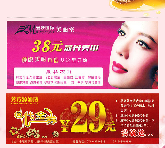 2、購物滿288元送價值100元曼妙國際半YJ定妝代金券(顧客憑購物小票到店參與活動)。